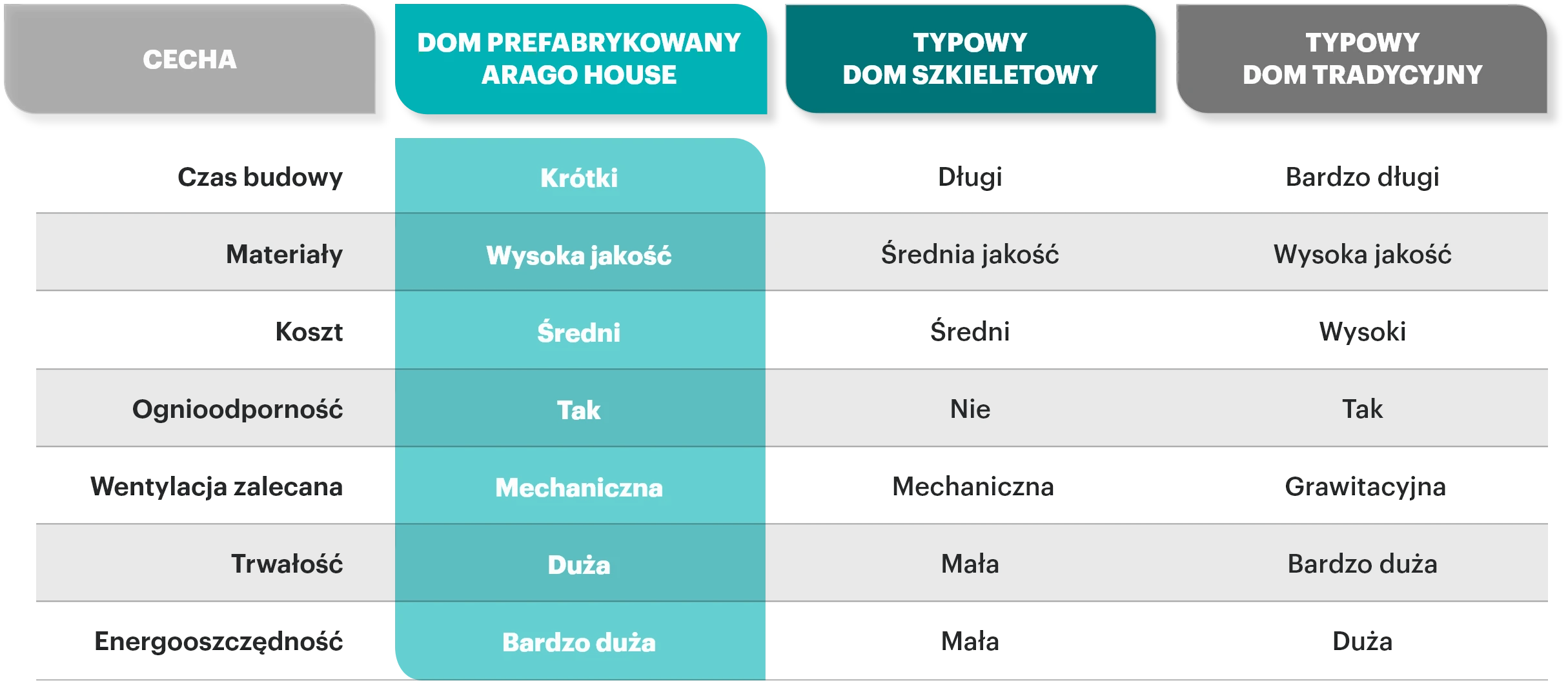 Tabela porównawcza domów prefabrykowanych Arago House, domów szkieletowych i domów tradycyjnych.