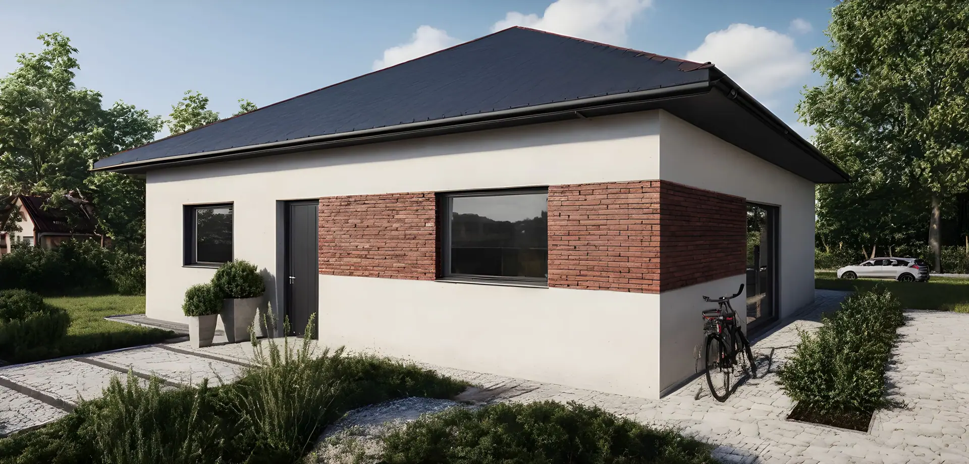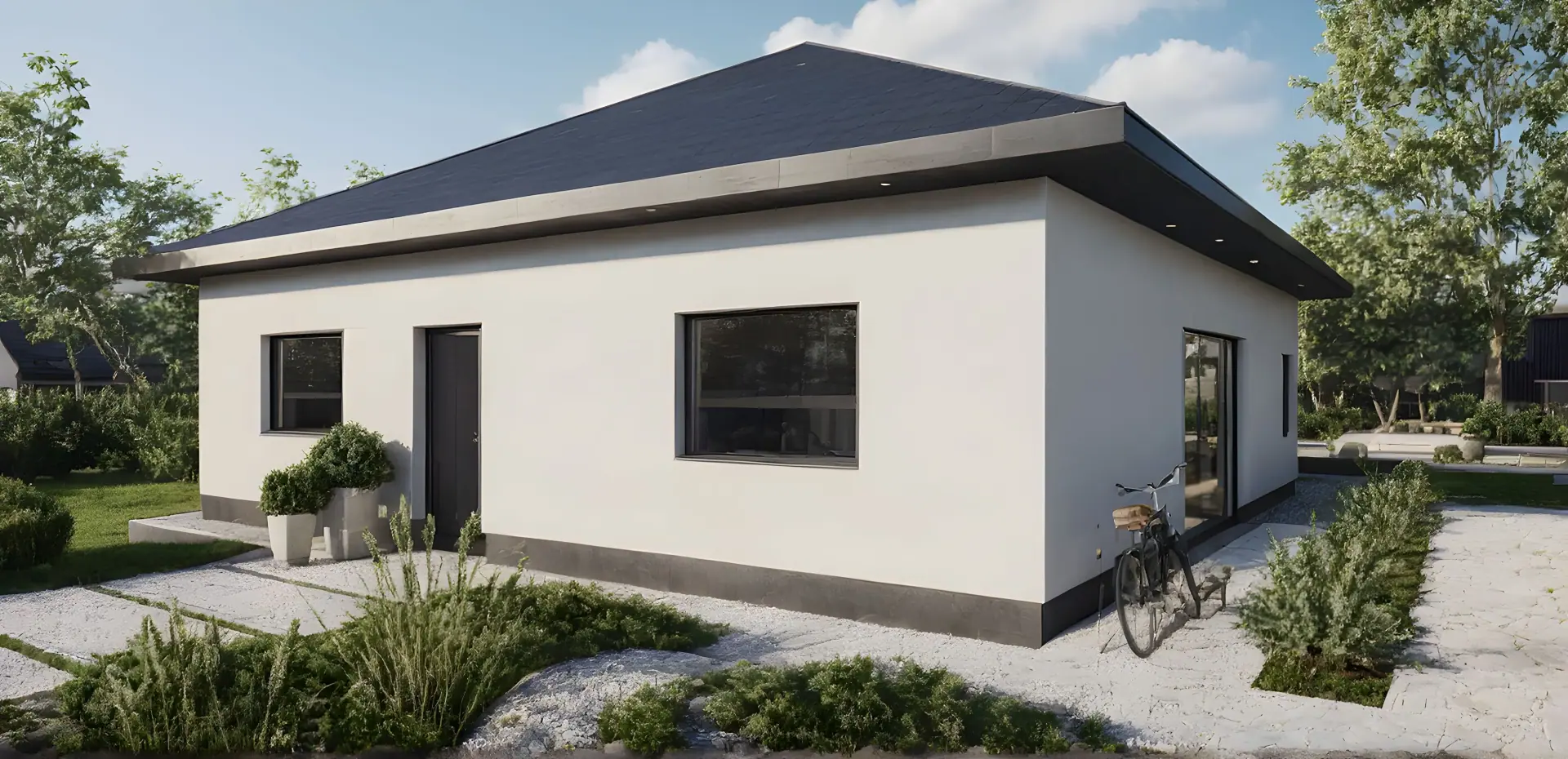 Dom możesz uzupełnić o taras, garaż, pergolę lub wiatę, tworząc spójną i funkcjonalną przestrzeń dopasowaną do potrzeb Twojej rodziny.