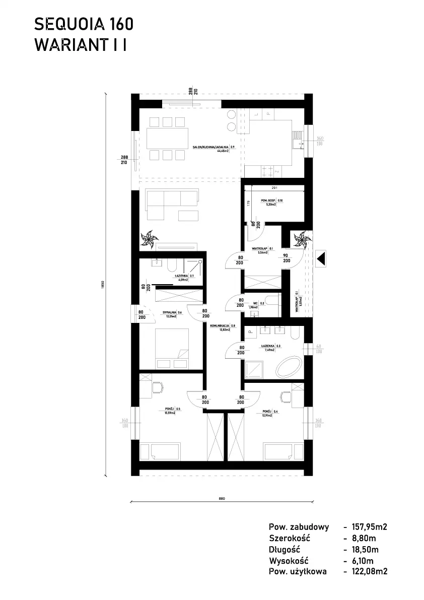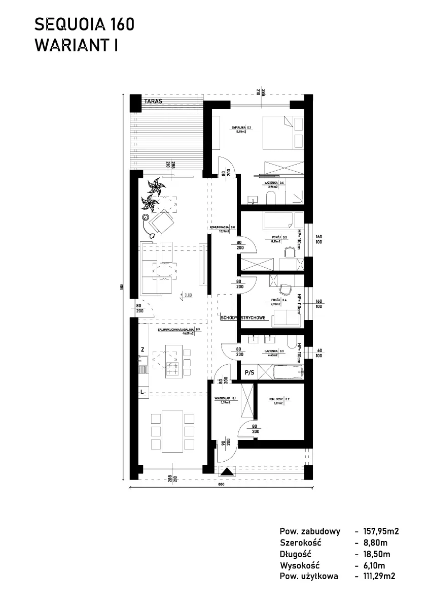 Sequoia 160 to największy dom w naszej ofercie – projekt stworzony dla rodzin, które oczekują przestronnych wnętrz i pełnej swobody aranżacyjnej.